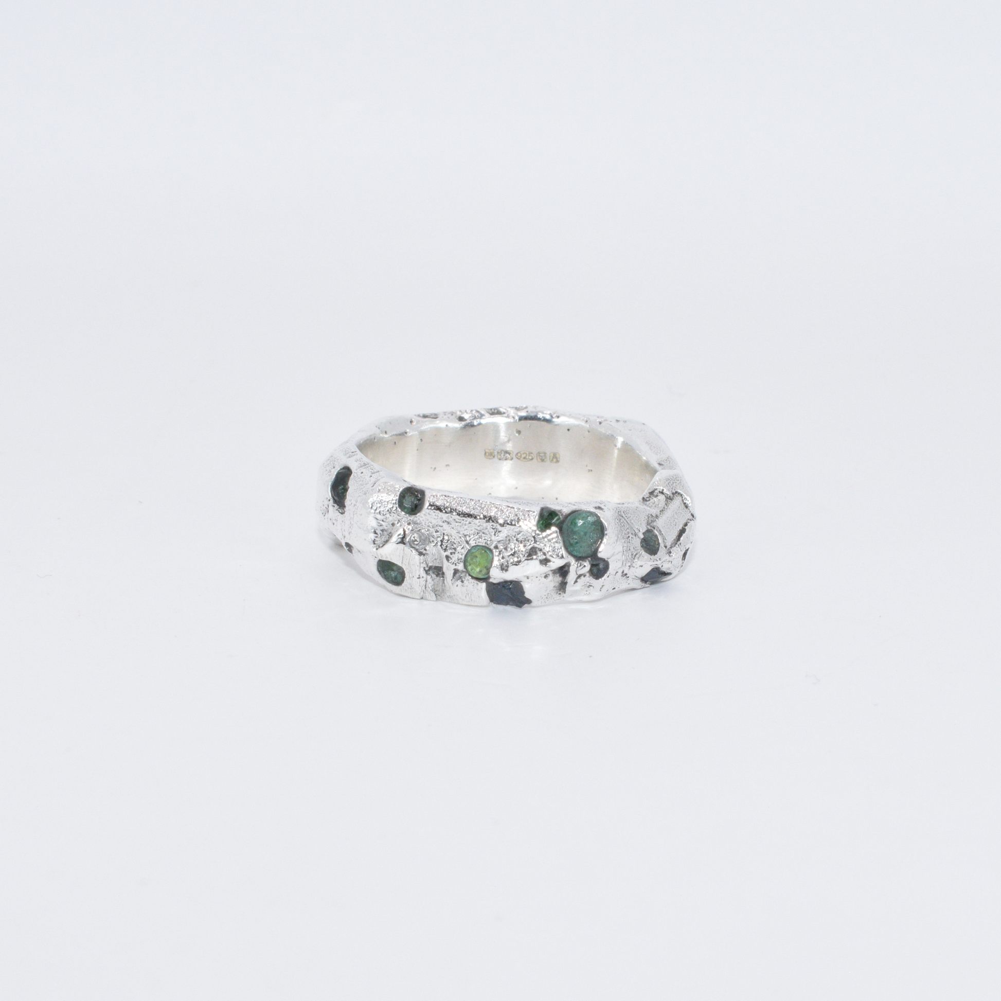 The result is a one of a kind gnarly silver band, scattered with shifting tones of green and blue. UK Size: R